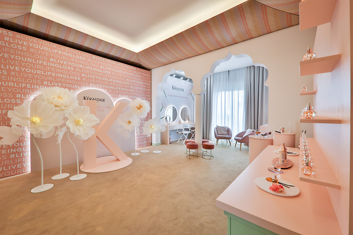 Gli ambienti classici dell’hotel sono stati trasformati in uno scenario immersivo, declinato nelle tonalità rosa e bianco: dal Welcome con installazioni iconiche al Photobooth floreale, fino alle aree dedicate al make up e all’hair styling, senza dimenticare il K Café, luogo di relax e conversazione.